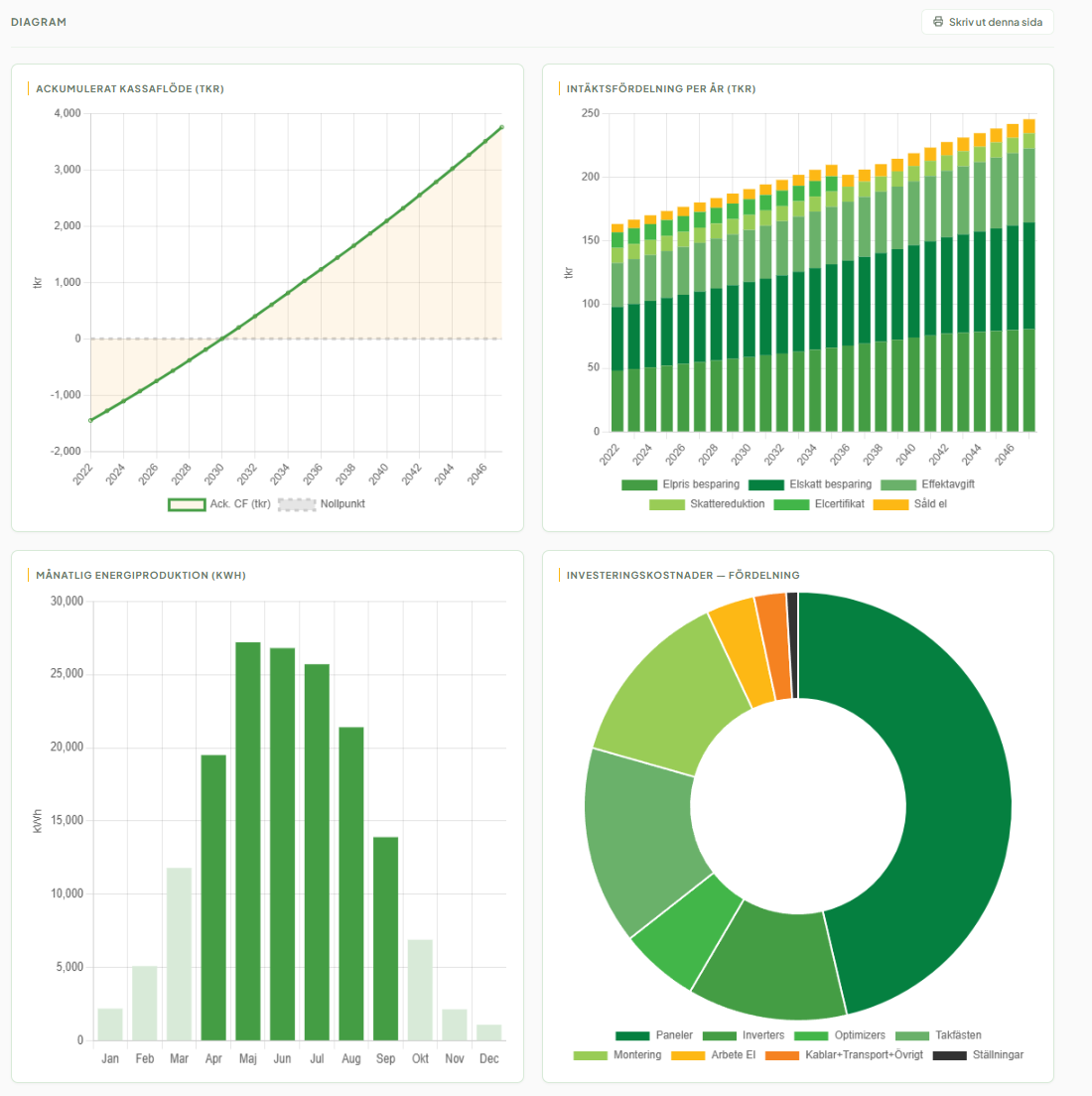 - Kassaflöde — 13-column year-by-year cash flow: production, tariff savings, certificate income, tax deductions, accumulated net.