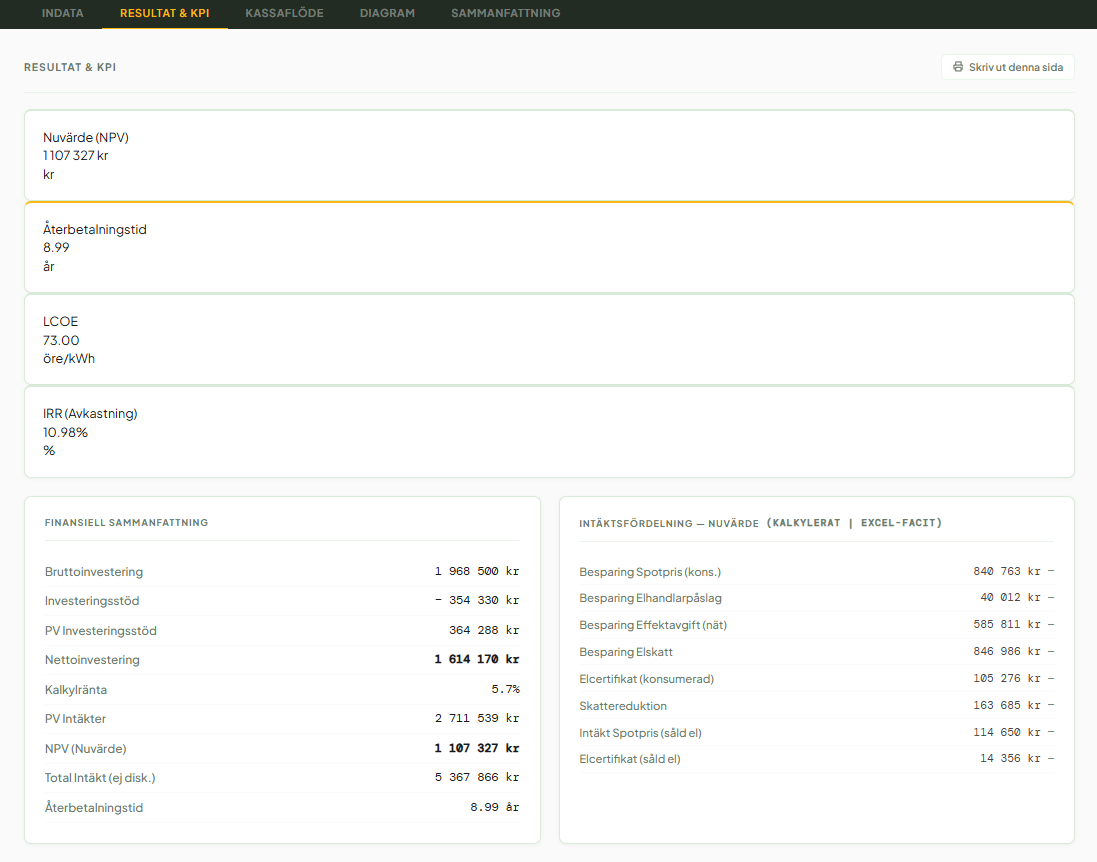 - Resultat & KPI — headline metrics, financial summary, PV-revenue split.