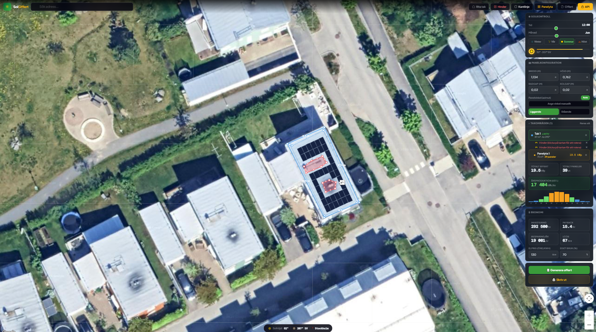 Two tools, one workflow. An installer needs to answer two questions for every lead: is it worth it? and what does the array actually look like on this roof? SolcellsKalkyl answers the first — a full Swedish investment case with NPV, IRR, LCOE, and payback. SolOffert answers the second — panel layout drawn on satellite imagery, sized against Google's Solar API, exported as a proposal.